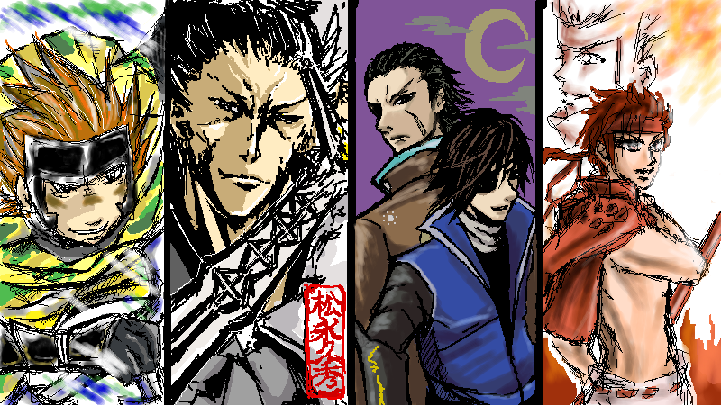 そして、右から、常様【真田&佐助】会長様【伊達&小十郎】花月様【久秀】虎刃【佐助】です☆ 皆さんやっぱりそれぞれの味を上手く出していて、カッコイイです(ノ∇≦*) 常様の真田の上半身のはだけ具合とかドキドキです(〃ω〃) キャァ♪ 抱きつきたいっ!バックのぼかし具合の色合いとか最高です! 会長さんの伊達&小十郎、毎回愛を感じます☆このコンビ大好きです!バックの月がまたいいです! 花月様の松永久秀、外伝のキャラだそうで、渋い笑みがなんとも頼もしくカッコイイです☆プチスランプだとはとても思えない上手さです(* ̄m ̄)ポ 今回常様の方で色々トラブルがあったようですが、タカミンがバージョンアップしていたおかげで、素敵なイラストが無事に完成し拝見出来て良かったです☆
