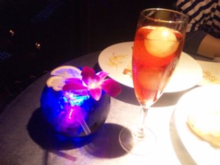 そこで最後に頼んだカクテルがこの写真です。ちなみに左の青く光っているのがミステリアス(…だったと思う)で右がムーン(月)。ここのカクテルはすべて宇宙の名前で書かれていて見ているだけで楽しい気持ちになる所でした。