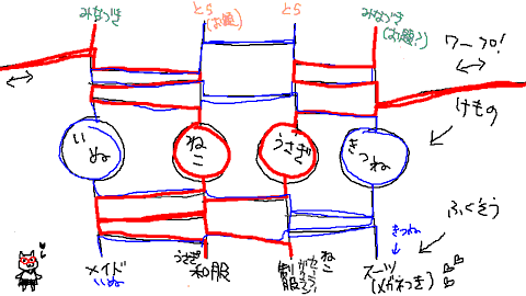 で、あみだくじでのお題とか面白そうだったので、みなづきちゃんがいつもやっているフリーダム方式でやることに(=v=) 互いに2個ずつ案を出し合いあみだにセッティング!