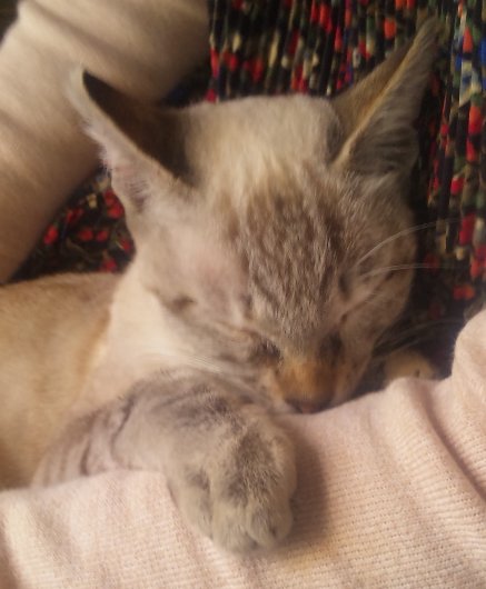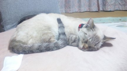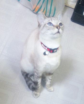 シャムとトラのミックスらしく、全体が薄茶で手、足、尻尾と顔の一部がトラ模様。耳と顔の一部と体がシャムっぽい。 目はしっかり青色。 高級感のあるにゃんこでございます。