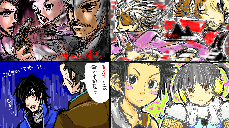 左上から、常様→“チーム信長”、左下会長様→“伊達&小十郎コンビ”、右下花月様→“蘭丸&いつぎコンビ”、そして右上が私→兄貴&豊臣“ありえねぇコンビ”です☆皆様描き慣れていて、カッコイイやら、可愛いやら鼻血ものです(ノ∇≦*) 会長の落書きフィーバーヤバイ位ツボでした☆